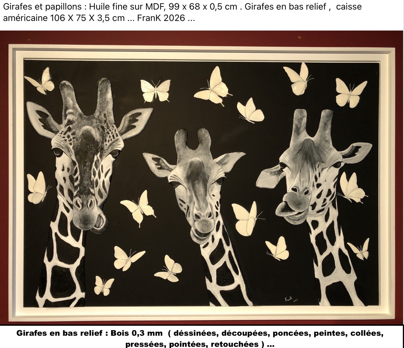 Huile fine sur MDF , Girafes en bas relief 0,3 mm . Caisse américaine 106 x 75 x 3,5 cm ...